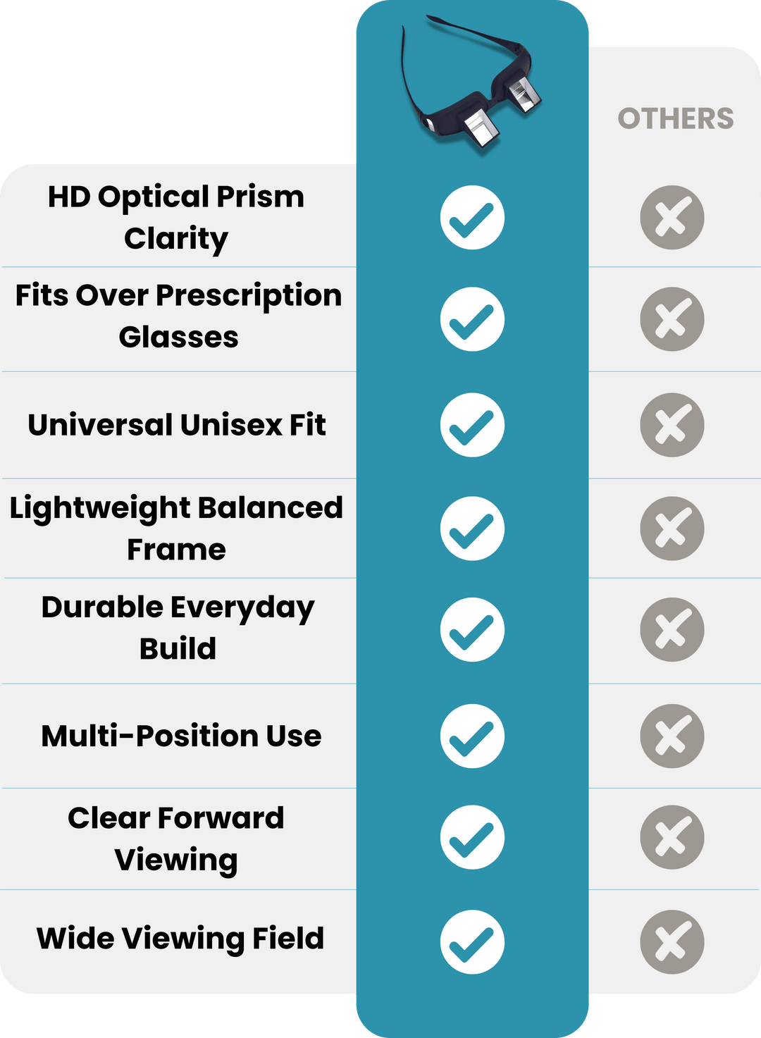 Universal Fit & Effortless Use: Lightweight and easy to wear, these prism glasses provide a clearer, more comfortable viewing angle with minimal effort. Their universal unisex design works in any position and can also fit over most prescription glasses.
