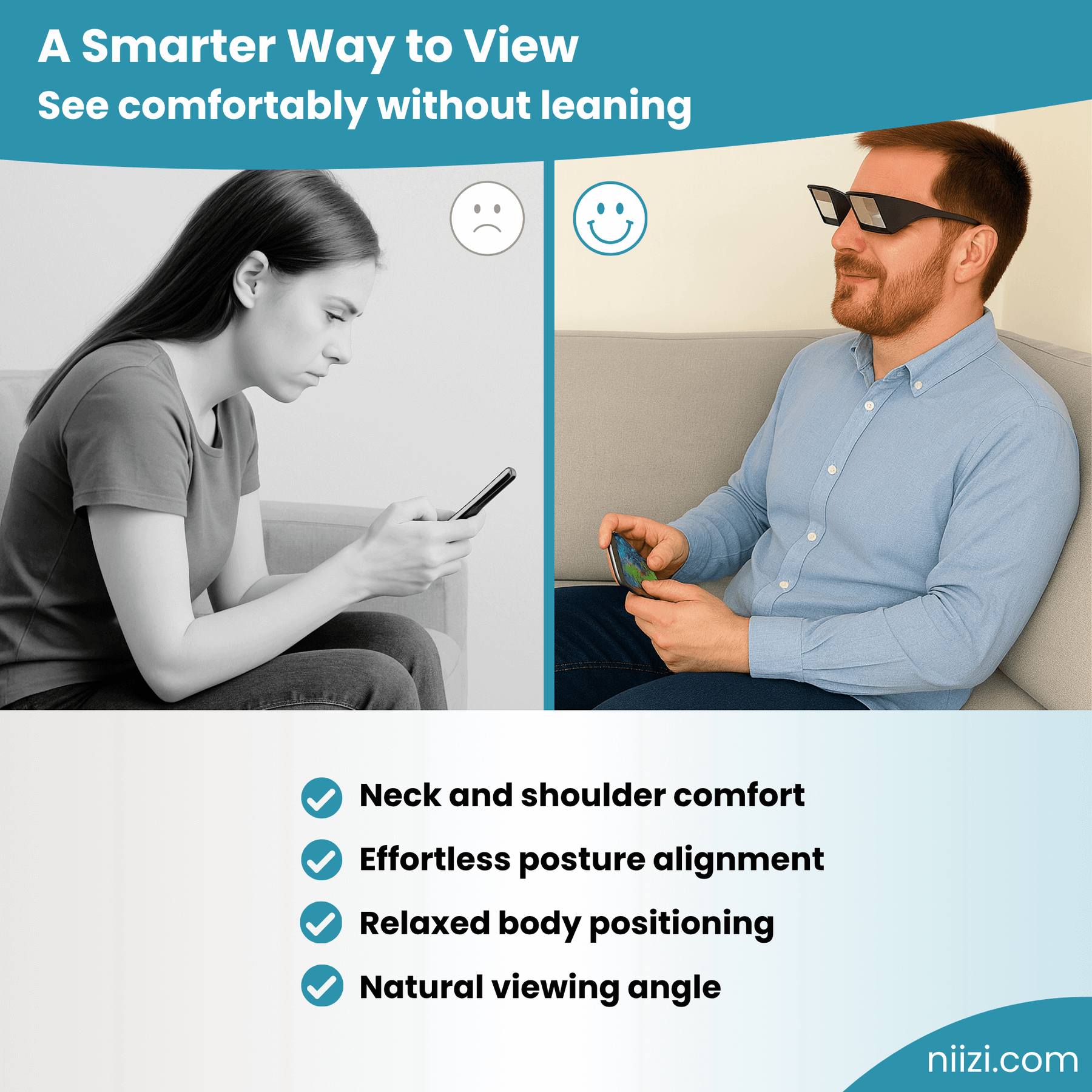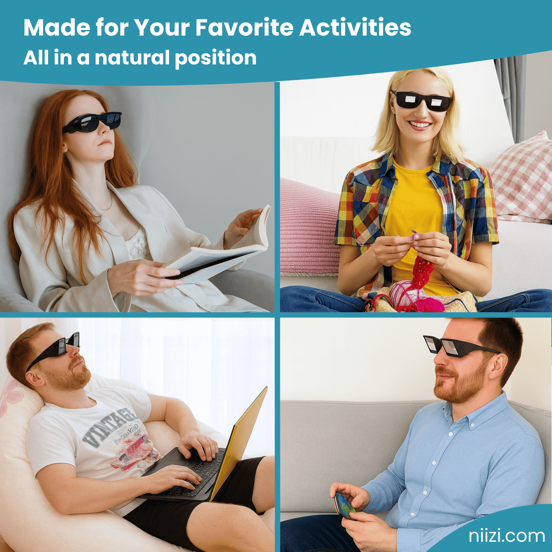 Comfortable Viewing for Any Activity: Niizi™ ErgoPosture Glasses redirect your line of sight downward, letting you read, watch, scroll, or craft without bending your neck. Whether sitting, reclining, or lying in bed, they help you enjoy your favorite activities in a more natural, relaxed position.